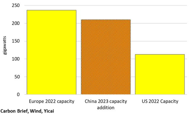 預(yù)計中國今年的太陽能發(fā)電量將增加210千兆瓦(圖3),接近美國2022年產(chǎn)能的兩倍,約為歐洲2022年產(chǎn)能的90%。