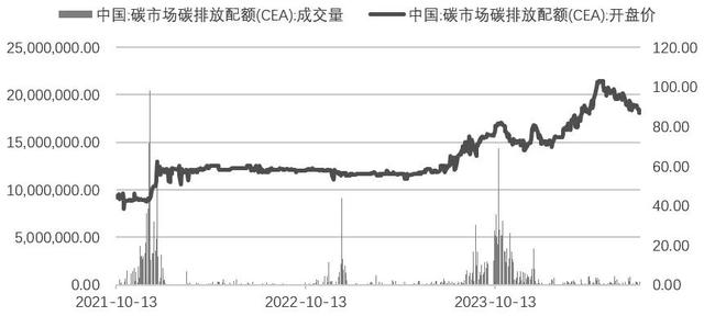 從碳排放權(quán)交易價(jià)格走勢(shì)看,2021年7月16日至2023年7月16日的兩年時(shí)間,基本穩(wěn)定在60元/噸。上市首日,開盤價(jià)為48元/噸,9點(diǎn)30分首筆全國(guó)碳排放配額交易撮合成功,價(jià)格為52.78元/噸,總共成交16萬(wàn)噸,交易額為790萬(wàn)元。當(dāng)日收盤,累計(jì)成交410萬(wàn)噸碳排放配額,成交額超過(guò)2.1億元,收盤價(jià)為51.23元/噸,較48元/噸上漲6.73%。