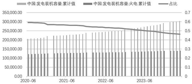 截至2024年5月,全國(guó)電力裝機(jī)容量為30.3733億千瓦,其中火電裝機(jī)容量為14.0113億千瓦,占比46.1303%,這是繼2023年7月火電裝機(jī)容量占比跌破50%后持續(xù)下降的表現(xiàn)。這較2020年9月提出“雙碳”目標(biāo)時(shí)58.6762%的占比下降了12.6649個(gè)百分點(diǎn)。