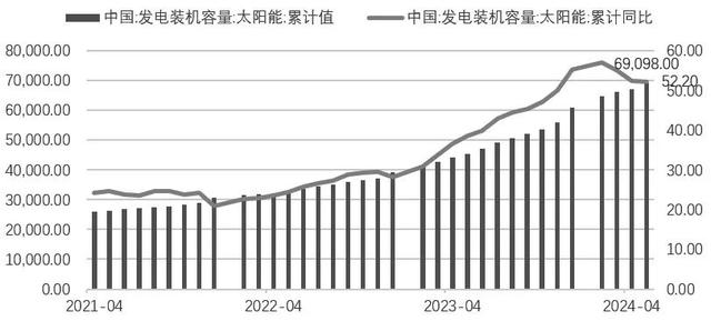 從光伏發(fā)電裝機(jī)容量和增速走勢(shì)可以看出,2021年以來(lái)一直以20%以上的速度增長(zhǎng),2023年年末增速達(dá)到55.20%,裝機(jī)總量達(dá)到6.0949億千瓦,較2022年年末增加21685萬(wàn)千瓦。截至2024年5月底,光伏發(fā)電裝機(jī)容量達(dá)到6.9098億千瓦,較2023年年底增加8149萬(wàn)千瓦,同比增速為52.20%。
