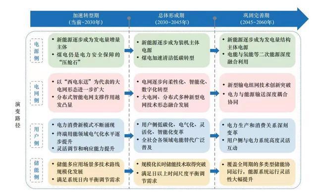 《藍(lán)皮書》指出,以2030年、2045年、2060年為新型電力系統(tǒng)構(gòu)建戰(zhàn)略目標(biāo)的重要時間節(jié)點,制定新型電力系統(tǒng)“三步走”發(fā)展路徑,即加速轉(zhuǎn)型期(當(dāng)前至2030年)、總體形成期(2030年至2045 年)、鞏固完善期(2045年至2060年),有計劃、分步驟推進新型電力系統(tǒng)建設(shè)的“進度條”。