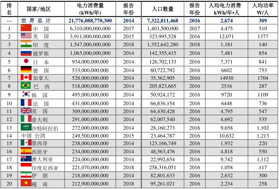 電力消費(fèi)最高的20個(gè)國家
