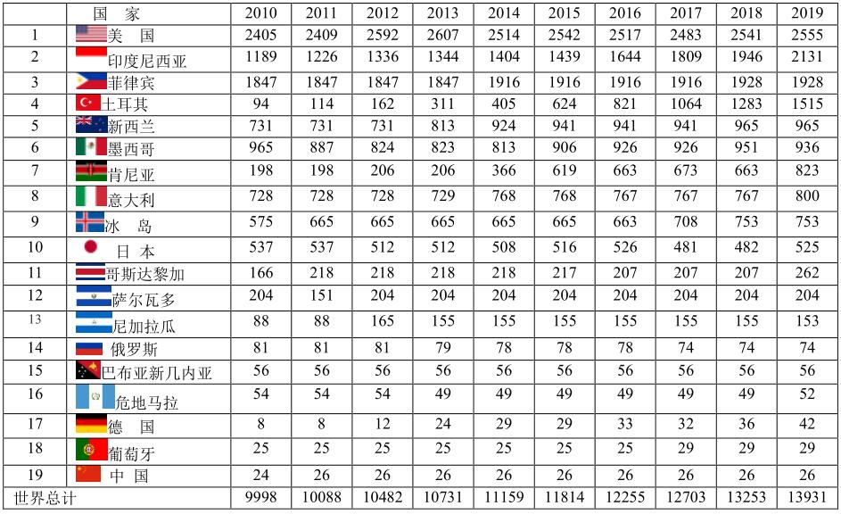 2019年占地?zé)嵫b機總?cè)萘孔疃嗟氖敲绹?18.3%)、印度尼西亞(15.3%)、菲律賓(13.8%)、土耳其(10.9%)、新西蘭(6.9%)。中國排序第19名,地?zé)嵫b機容量進展不大。