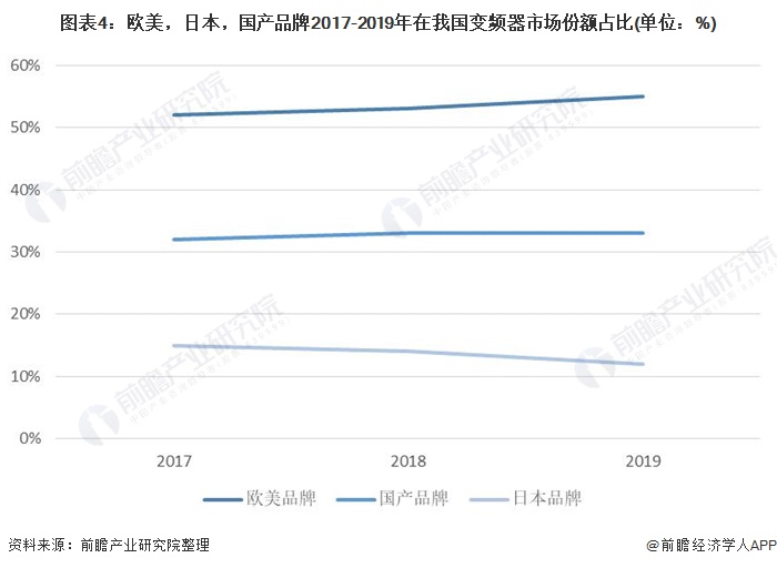而中國(guó)國(guó)產(chǎn)變頻器企業(yè)這幾年市場(chǎng)份額一直在逐年增加。從各品牌的市場(chǎng)份額來(lái)看,外資品牌占據(jù)變頻器市場(chǎng)的主要份額,上世紀(jì)80年代日本企業(yè)率先進(jìn)入我國(guó)的變頻器市場(chǎng),之后歐美品牌大量涌入,形成了歐美與日本品牌共同主導(dǎo)我國(guó)變頻器市場(chǎng)的競(jìng)爭(zhēng)格局。近年來(lái),進(jìn)口替代進(jìn)程正在不斷推進(jìn),國(guó)產(chǎn)企業(yè)正在逐步占據(jù)日本企業(yè)市場(chǎng)份額。從2017年至2019年日本變頻器行業(yè)市場(chǎng)份額逐年下降,國(guó)產(chǎn)品牌的上升且維持在33%左右,歐美品牌則依舊是變頻器市場(chǎng)份額占比最高的。2019年,歐美品牌市場(chǎng)份額占比為55%,國(guó)產(chǎn)品牌市場(chǎng)份額占比為33%,日本品牌的市場(chǎng)份額占比為12%。