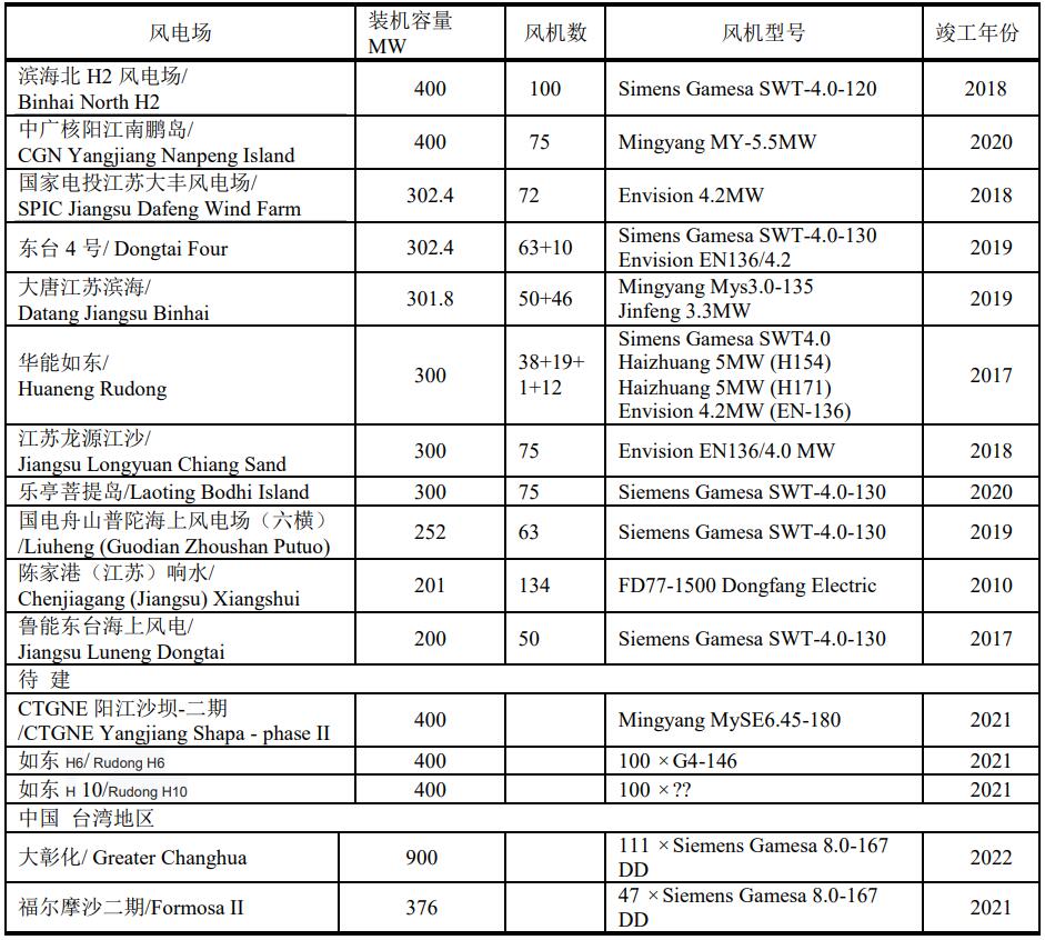 目前全球裝機容量大于200 MW的海上風電場有61個風電場在運行,待建的海上風電場有16座。目前海上風電場主要在西歐國家,如德國和英國。