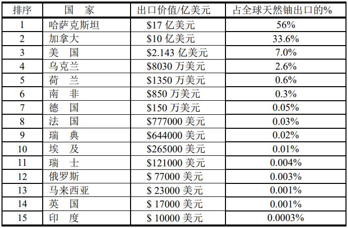 2020年出口價值最高的天然鈾的15個國家,這15個國家出口天然鈾占總量的99.999%。