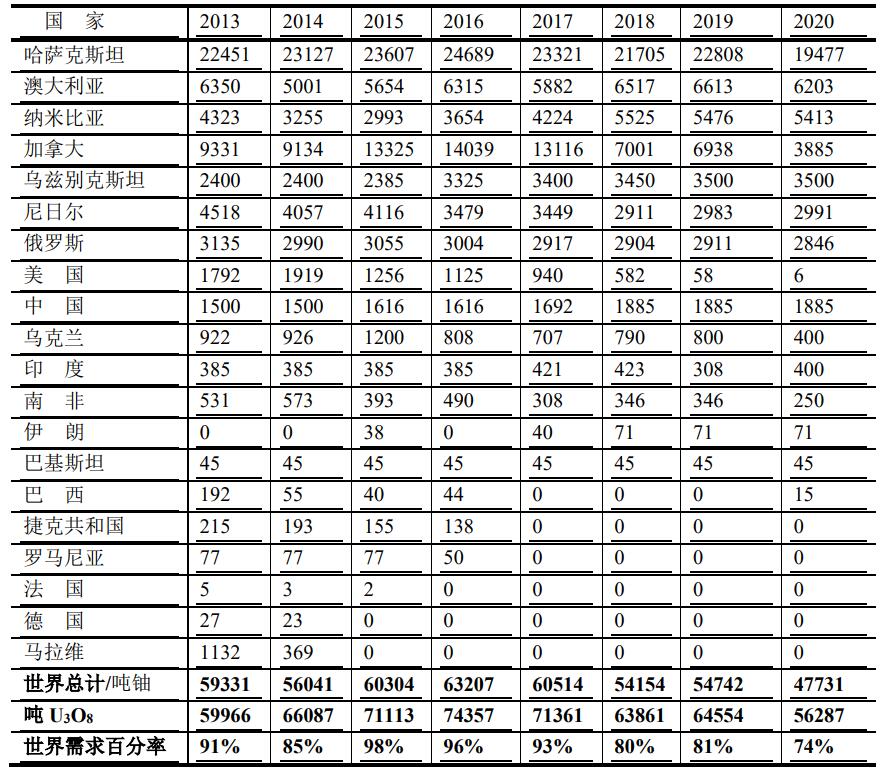 2020年世界上最大的鈾生產(chǎn)國仍然是哈薩克斯坦(占世界總產(chǎn)量的19477/47731=40.8%)、澳大利亞(6203/47731=13.0%)和納米比亞(5413/47731=12.0%)等這3個國家占全球總產(chǎn)量的65.8%;其他還有加拿大(8.1%)、烏茲別克斯坦(7.3%)、尼日爾(6.3%)和俄羅斯(6.0%)。