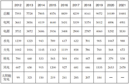 表7 2012~2021年全國(guó)電力投資情況(單位:億元)