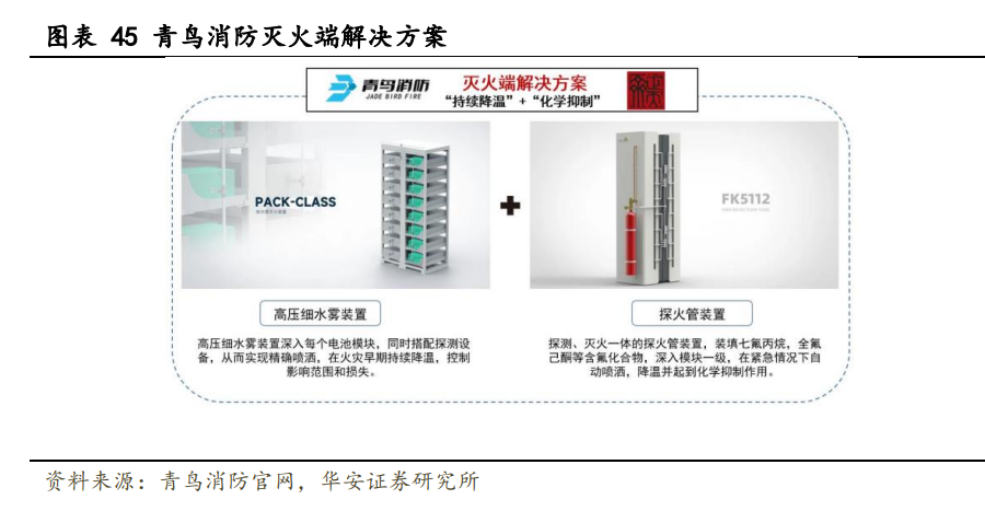 消防市場有望高速增長。儲能消防市場規(guī)模=新增儲能裝機容量*儲能系統(tǒng)成本* 消防成本占比。隨原材料價格逐步回落與鋰電池儲能技術(shù)逐步提升,電化學儲能系統(tǒng) 成本將逐年降低,根據(jù) BNEF 測算,2025 年有望降至 1.4 元/Wh 左右。根據(jù)青鳥消防公告,目前消防占儲能系統(tǒng)成本約 3%,隨著風光電高比例接入電網(wǎng),儲能利用率將 快速提升,進而帶來更旺盛的消防需求,相應消防成本占比逐年提升。儲能消防目前 單站價值量較低,行業(yè)未形成統(tǒng)一標準。預計隨《電化學儲能電站安全規(guī)程》正式稿 的出臺,將有效帶動行業(yè)規(guī)范發(fā)展,提升儲能消防產(chǎn)品質(zhì)量與數(shù)量,行業(yè)有望迎來供 需兩端同步改善。 國安達:國安達為國內(nèi)特種消防龍頭,在滅火劑、驅(qū)動劑、產(chǎn)品結(jié)構(gòu)等方面擁有 多項核心技術(shù)。近年來公司解決了新能源汽車鋰電池箱、特高壓換流站等特殊領域的 消防難題,并前瞻性布局電化學儲能消防產(chǎn)品。 國安達與國家電網(wǎng)有堅實的長期合作基礎,自 2012 年開始合作,于 2019 年 12 月 研發(fā)出變壓器固定自動滅火系統(tǒng),2020 年 10 月通過了聯(lián)合驗收,所使用的“壓縮空 氣泡沫滅火技術(shù)”最終確定為特高壓換流站的關(guān)鍵消防配套技術(shù)。同時與國家電網(wǎng)也 建立了緊密的合作研發(fā)關(guān)系。