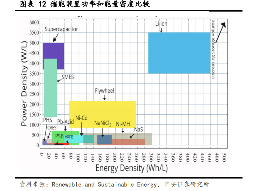 抽水蓄能占據(jù)儲能絕對份額,鋰離子電池是電化學儲能主流技術(shù)路線。結(jié)果表明, 通過對不同儲能技術(shù)的功率和能量密度的比較,可以確定儲能裝置的尺寸。儲能裝置的體積隨著功率和能量密度的增加而減小,因此鋰離子電池可以獲得更小的尺寸。另一方 面,左下角顯示了更大體積的儲能設備。所有熱儲能和電化學儲能裝置(Ni-MH, Na-S, Li-ion & NaNiCl2)的能量密度都高于其他儲能裝置。 相反,SCES、SMES 和 FES 的功率密度高于其他儲能設備類型。此外,CAES 和 PHS 的 能量密度最小,同時,CAES、PHS、VRFB、PSB 和 Zn Br 提供的功率密度也最小。