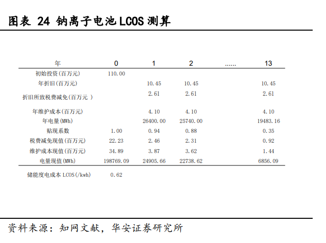 鈉離子電池儲能全壽命儲能度電成本(LCOS)測算核心假設(shè): 初始投資成本:當(dāng)前鋰離子產(chǎn)業(yè)化正在推進(jìn)中,假設(shè)成熟時(shí)期可比鐵鋰電池低 20- 30%。目前成本約 370 元/kWh, 而且隨著產(chǎn)業(yè)鏈成熟,材料成本有望進(jìn)一步下探,結(jié)合 結(jié)構(gòu)件好電氣件成本,初始容量投資有望控制在 500-700 元/kWh。 年度運(yùn)維成本:每年需要 3.7%左右,為 0.04 元/W。 壽命:可循環(huán) 2000 次以上,中科海鈉、寧德時(shí)代等表示其產(chǎn)品可達(dá) 3000 次,隨 著研發(fā)持續(xù)投入和技術(shù)迭代,電池循環(huán)壽命有望突破 8000 次以上。 循環(huán)效率:可以達(dá)到 84-90%。 貼現(xiàn)率:考慮到當(dāng)前央企能源企業(yè)的融資成本在 4-5%,取 6%作為折現(xiàn)率。