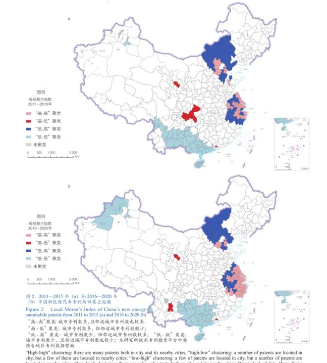 中國新能源汽車產業(yè)有效專利在城市間存在一定的空間集聚現象,并且集聚程度有上升趨勢。由表3可知,2011—2015年和2016—2020年中國新能源汽車專利的全局莫蘭指數均通過了5%的顯著性檢驗,并且莫蘭指數均為正值,但整體較低,這表示中國新能源汽車的專利在城市間存在較弱的空間集聚現象。相較于2011—2015年,2016—2020年的莫蘭指數有所提升,這也反映出隨著更多城市參與到新能源汽車的研發(fā)中,專利申請的空間集聚現象逐漸凸顯。