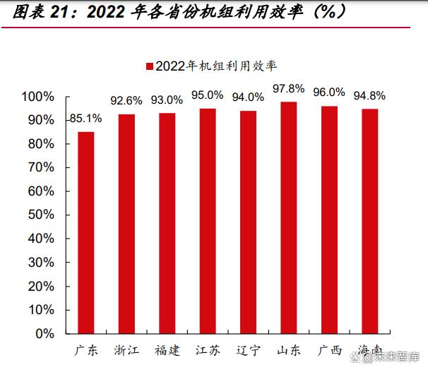 我國(guó)在運(yùn)、在建核電項(xiàng)目均處于沿海發(fā)達(dá)省份。我國(guó)在運(yùn)、在建、核準(zhǔn)核電機(jī)組 分布在東部沿海 24 座核電站,其中漳州、惠州、霞浦、三澳、徐大堡等 5 個(gè)核電站 為新建核電站,尚沒(méi)有在運(yùn)核電機(jī)組。我國(guó)核電站分布在東部沿海 8個(gè)省份,自北向 南分別是遼寧、山東、江蘇、浙江、福建、廣東、廣西、海南。 我國(guó)核電機(jī)組利用效率均處于較高水平。2022 年我國(guó)核電項(xiàng)目平均利用率達(dá) 91.69%,除廣東外我國(guó)其他省份核電利用率均高于 90%,主要由于臺(tái)山核電廠 1 號(hào) 機(jī)組于 2021 年 7 月 31 日開(kāi)始臨停大修,直到 2022 年 8 月 15 日才并網(wǎng)成功。我國(guó) 在運(yùn)、在建核電項(xiàng)目有望維持高利用效率,基本上無(wú)需擔(dān)心消納問(wèn)題。