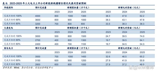 未來三年新能源裝機(jī)規(guī)模及盈利貢獻(xiàn)有望提速。假設(shè)華能、大唐、國電三家上市公司未來 新增的新能源裝機(jī)量中風(fēng)電光伏比例為 4:6,風(fēng)光維持 22 年的發(fā)電小時(shí)數(shù),平均發(fā)電小時(shí) 數(shù)分別為 1770/1841/1731h;平均上網(wǎng)電價(jià) 520 元/兆瓦時(shí);成本收入比為 45%。以完成 “十四五”新能源裝機(jī)規(guī)劃量 90%的情況為例,我們預(yù)計(jì) 2023-2025 年華能國際新增裝機(jī) 量分別為 800/900/1000 萬千瓦,新增毛利貢獻(xiàn)分別達(dá)到 38.3/43.1/47.8 億元;我們預(yù)計(jì) 23-25 年大唐發(fā)電新增裝機(jī)量分別為 400/800/1300 萬千瓦,新增毛利貢獻(xiàn)分別達(dá)到 19.7/39.5/64.1 億元;我們預(yù)計(jì) 23-25 年國電電力新增裝機(jī)量分別為 600/900/1200 萬千瓦, 新增毛利貢獻(xiàn)分別達(dá)到 27.9/41.9/55.9 億元。