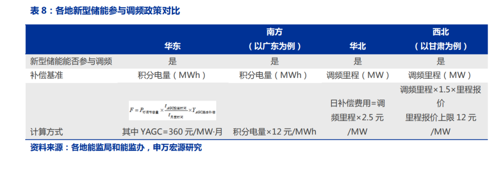 調(diào)頻輔助服務經(jīng)常因其名稱而讓人迷惑,但調(diào)頻輔助服務本質(zhì)上還是對電能量的調(diào)節(jié)。 調(diào)頻輔助服務理論上就是為了彌補調(diào)頻輔助服務是為了彌補電力市場和調(diào)峰輔助服務無法 解決的實時平衡問題,主要依靠自動控制技術來進行調(diào)整。 調(diào)頻已經(jīng)成為儲能的重要收入來源之一。各地陸續(xù)允許新型儲能參與調(diào)頻輔助服務市 場,而目前在多數(shù)地區(qū),調(diào)頻輔助服務已經(jīng)成為儲能最重要的收益來源。對于調(diào)頻輔助補 償基準,華東和南方區(qū)域采用積分電量(即調(diào)頻容量乘以調(diào)用時間),而華北和甘肅則采 用調(diào)頻里程(即調(diào)頻容量乘以調(diào)用次數(shù))。調(diào)頻補償?shù)挠嬎惴绞讲⒉恢匾?,重要的是看新型儲能參與調(diào)頻輔助服務相比于火電等傳統(tǒng)機組是否存在優(yōu)勢。華東、南方區(qū)域儲能與火 電相比,補償計算方式?jīng)]有任何區(qū)別。華北區(qū)域同等調(diào)頻里程情況下,儲能的補償費用僅 有火電的一半。而對于甘肅省,補償費用則高于火電。