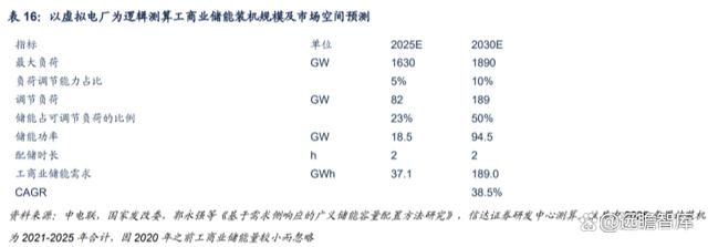 虛擬電廠帶來工商業(yè)儲(chǔ)能遠(yuǎn)期需求超預(yù)期的可能?;诜植际焦夥难b機(jī)并估計(jì)儲(chǔ)能的滲透率,由于目 前量較小,滲透率較低,且工商業(yè)企業(yè)眾多,變化較大。能夠認(rèn)為工商業(yè)儲(chǔ)能提供給用戶側(cè)充足的靈活 性資源,奠定虛擬電廠的發(fā)展基礎(chǔ),而虛擬電廠的建設(shè)增添未來收益增長(zhǎng)的預(yù)期,或?qū)⒏淖児ど虡I(yè)儲(chǔ)能 的投資屬性,進(jìn)而促進(jìn)工商業(yè)儲(chǔ)能的發(fā)展,打開工商業(yè)儲(chǔ)能的遠(yuǎn)期空間。這或?qū)硐掠纹髽I(yè)的觀念的改變、儲(chǔ)能的剛需屬性凸顯,進(jìn)而有望帶動(dòng)儲(chǔ)能滲透率的快速提升。預(yù)計(jì)在虛擬電廠建設(shè)順利的情況下, 工商業(yè)儲(chǔ)能 2025、2030 累計(jì)裝機(jī)有望達(dá) 37GWh、189GWh。