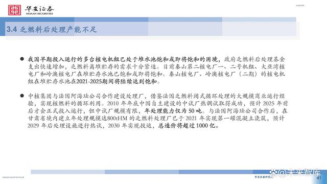 2007年,我國確定了符合國情的閉式燃料循環(huán)路線。乏燃料后處理屬于高精尖技術,處理廠建設需耗時10 年。目前,法國、日本、印度等國乏燃料后處理產能已可覆蓋最新年產生量,而我國僅有中核四0四有限 公司于2010年投產的中試廠產能為50tHM/年。 隨著壓水堆裝機容量快速增長,我國乏燃料的總量也將迅速增長。當前,我國乏燃料后處理基礎研究與俄 羅斯、美國、法國等國仍存差距,后處理關鍵設備如剪切機、溶解器等仍有待進一步研發(fā),尚未建成商用 后處理廠且不具備相應的運行經驗。