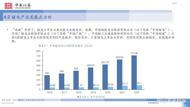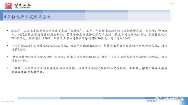 據中國核能行業(yè)協(xié)會發(fā)布的2022年能源產品產量統(tǒng)計數(shù) 據顯示,中國核能發(fā)電量僅占總發(fā)電量的4.98% ,低于 中亞和東亞平均值6.3%相比于北美的 18.8% ,北歐、西 歐和南歐的 24.2% ,東歐的 22.1% ,中國核電在低碳政 策背景下的發(fā)展?jié)摿Ψ浅4蟆?此外,無論是國內大規(guī)模上馬核電項目還是核電走向國 際市場,其經濟效益十分顯著。在國內,核電項目被稱 為印鈔機,在雙碳減排的驅動下,以前還受到電網調峰 要求的各核電站,近兩年來已經是應發(fā)盡發(fā),機組有效 利用小時數(shù)紛紛創(chuàng)出新高,電廠效益節(jié)節(jié)攀升。核電項 目投資也受到各地方政府和各大銀行的大力支持和追捧。 作為一個政策導向型顯著的行業(yè),近年來迎來了密集的 政策利好,可以預見我國核電行業(yè)將迎來一個高質量發(fā) 展的黃金期。