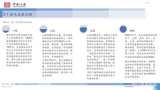 目前世界主流核電站皆采用第二代或第三代核電技術。其中,第二代和第三代的 主要核電堆型包括壓力堆和沸水堆等,在安全性和經濟性上較前一代都有提升。第四代核電技術以在安全 性、經濟性、核廢物處理、防止核擴散上更為出色,代表堆型包括鈉冷快堆、鉛冷快堆、氣冷快堆、超高 溫氣冷堆等,目前主要研發(fā)試驗階段,商業(yè)化預計在2030年左右實現(xiàn)。