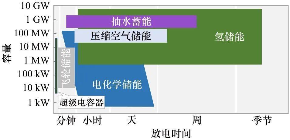 ①在新能源消納方面,氫儲能在放電時間(小時至季度)和容量規(guī)模(百吉瓦級別)上的優(yōu)勢比其他儲能明顯,如圖1所示;