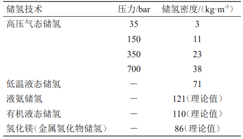 與其他燃料相比,氫的質(zhì)量能量密度大,但體積能量密度低(汽油的1/3000),因此構建氫儲能系統(tǒng)的重要前提條件之一是在較高體積能量密度下儲存氫氣。目前,主要儲氫方式可以分為物理儲氫和化學儲氫。物理儲氫包括高壓氣態(tài)儲存技術、低溫液態(tài)儲存技術和地質(zhì)儲氫技術;化學儲氫包括固態(tài)儲存技術、有機液態(tài)儲氫技術和液氨儲氫技術。不同儲氫技術的密度如表2所示。