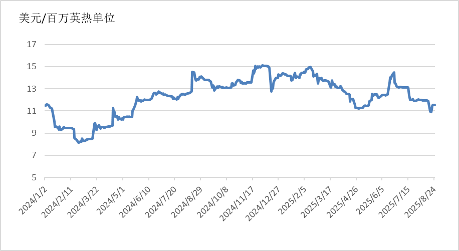 截至8月25日,普氏日韓LNG(JKM)期貨價(jià)格收于11.55美元/百萬英熱單位,月環(huán)比下降2.74%,相較2024年同期的13.82美元/百萬英熱單位,下降16.43%。
